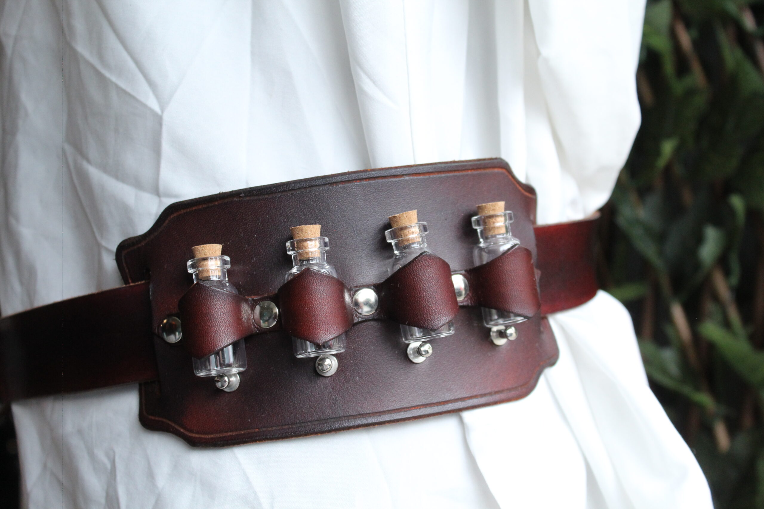 Pochette d’alchimiste réalisée à la main en cuir de vachette tannage végétal. Les passants permettent d’y gllisser une ceinture de largeur 4cm maximum. Cette pochette est vendu avec ses 4 fioles en verre.